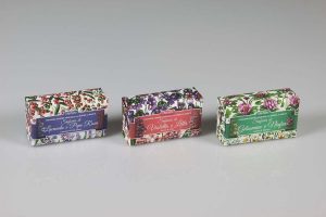 Soaps are packed in tiny boxes, licle master-pieces, decorated with designs of flowers and fruits.