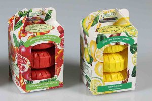 Round soaps packed in tiny boxes, licle master-pieces, decorated with designs of flowers and fruits.
